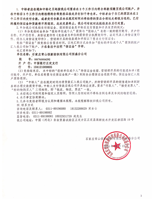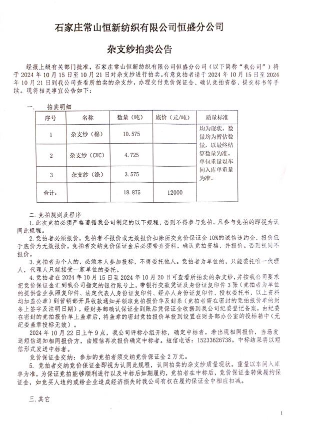 石家莊常山恒新紡織有限公司恒盛分公司 雜支紗拍賣公告